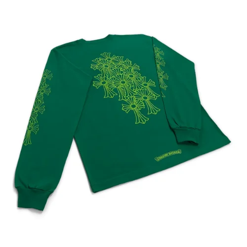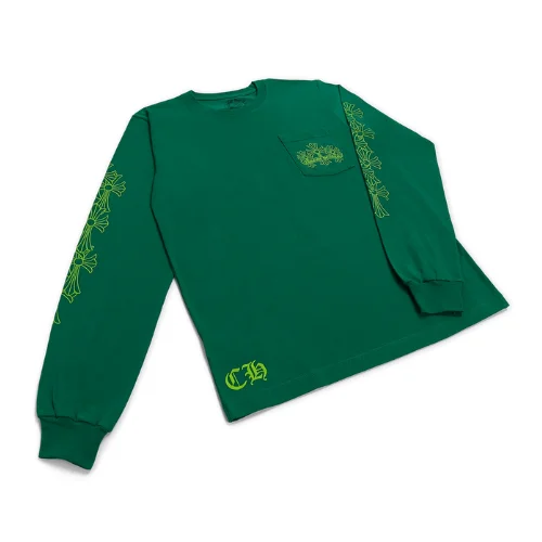 The Cemetery Cross Chrome Hearts Long Sleeve T-Shirt Green is designed to be as versatile as it is distinctive. Its bold green color and intricate detailing make it a standout piece that can elevate any outfit. For a casual streetwear look, pair it with distressed jeans and sneakers. For a more refined yet edgy ensemble, combine it with Chrome Hearts leather pants or a denim jacket adorned with silver accessories.