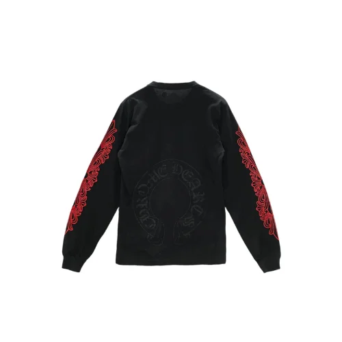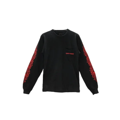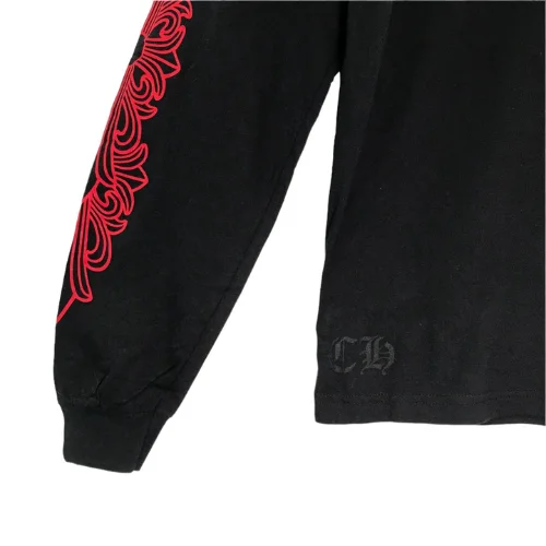 The centerpiece of this long sleeve tee is the Red Scroll Chrome Hearts logo, elegantly printed across the chest and pocket area. The vibrant red contrasts against the deep black or crisp white fabric (depending on variation), creating a visually powerful design that stands out without overpowering.
