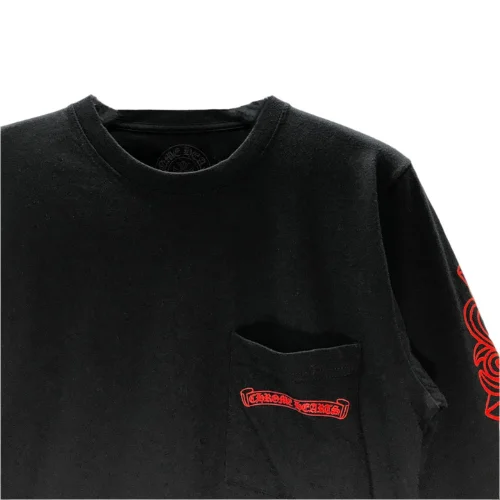 The Long Sleeve Red Scroll Chrome Heart Pocket Tee transitions seamlessly between casual and upscale wear. Pair it with distressed jeans, leather pants, or layered accessories to achieve that effortlessly bold Chrome Hearts aesthetic.